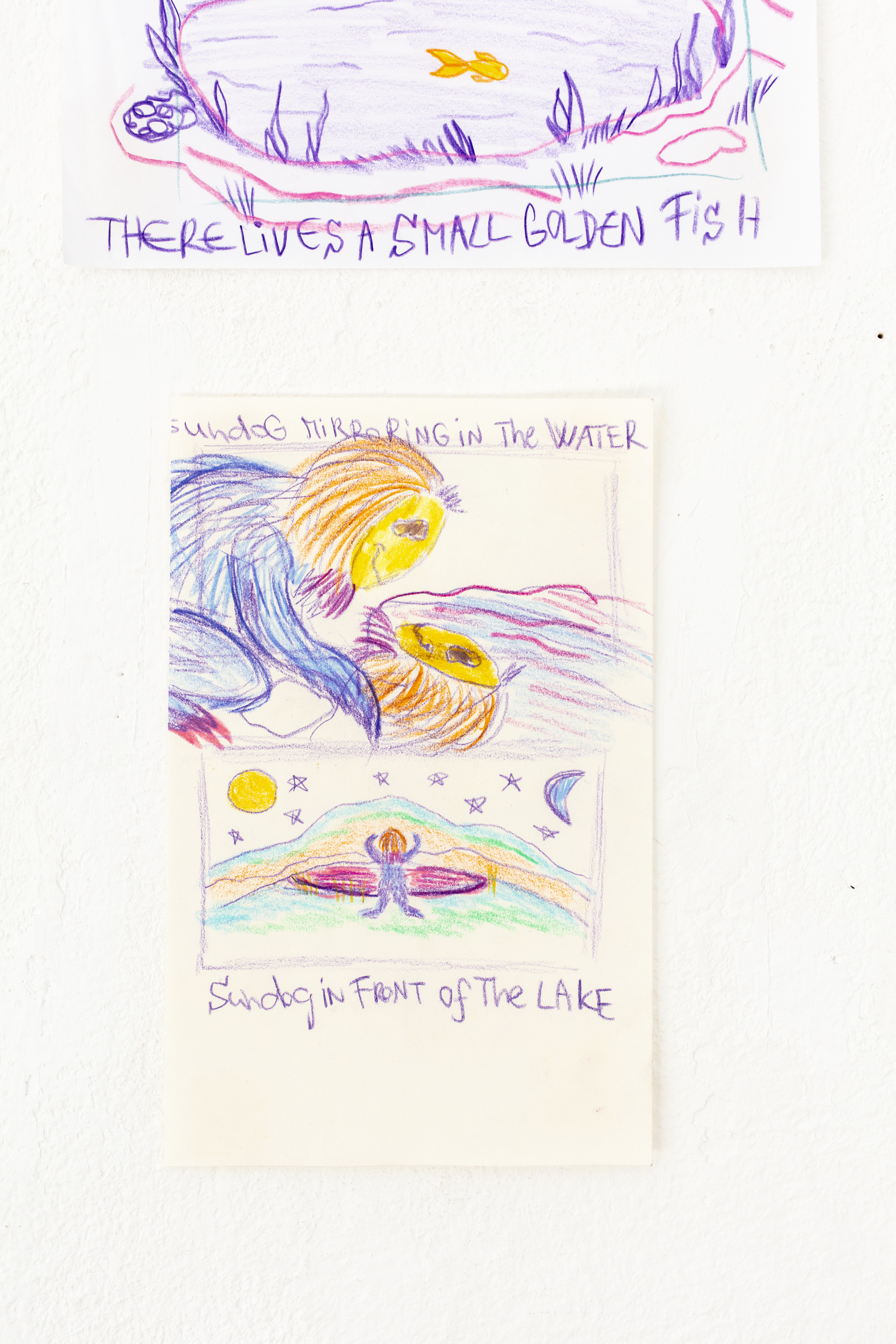 The Sun Dog. A speculative hybrid identity, represented in the exhibition through an animated film accompanied by a voiceover, constructs a vision of climatic affectivity. It is an open body, permeated by external political, ecological, and psychological pressures. An avatar of ideological grotesque, it embodies the crisis of anthropocentric identity, displaying the iconography of right-wing populism and a toxic form of national identity on a faded baseball cap. Yet the cap is not aggressively red, as in its most notorious form – its washed-out, pink hue carries a certain subversive hope for better (?) post-worlds, or perhaps signals exhaustion with harmful inherited patterns.